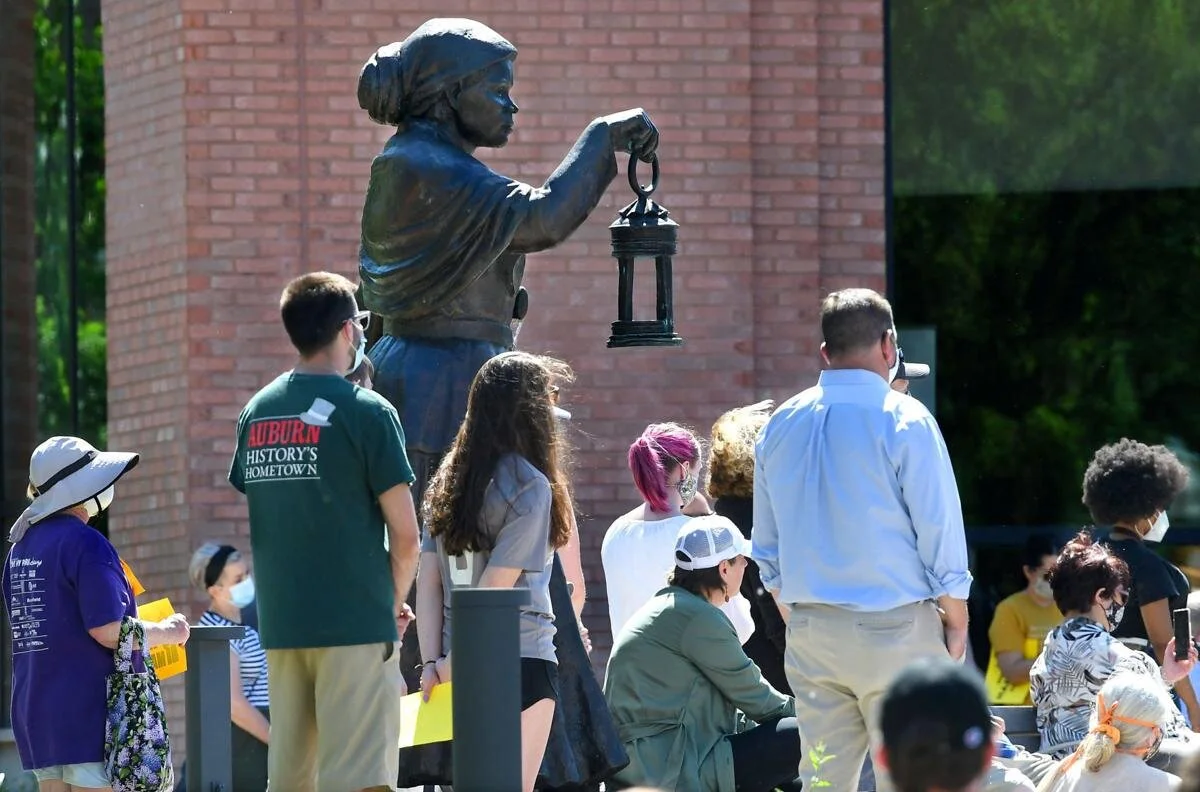 Protesters gather around the Harriet Tubman statue to listen to speakers during a demonstration of solidarity for racial justice at the NYS Equal Rights Heritage Center in Auburn June 6.Kevin Rivoli, The Citizen